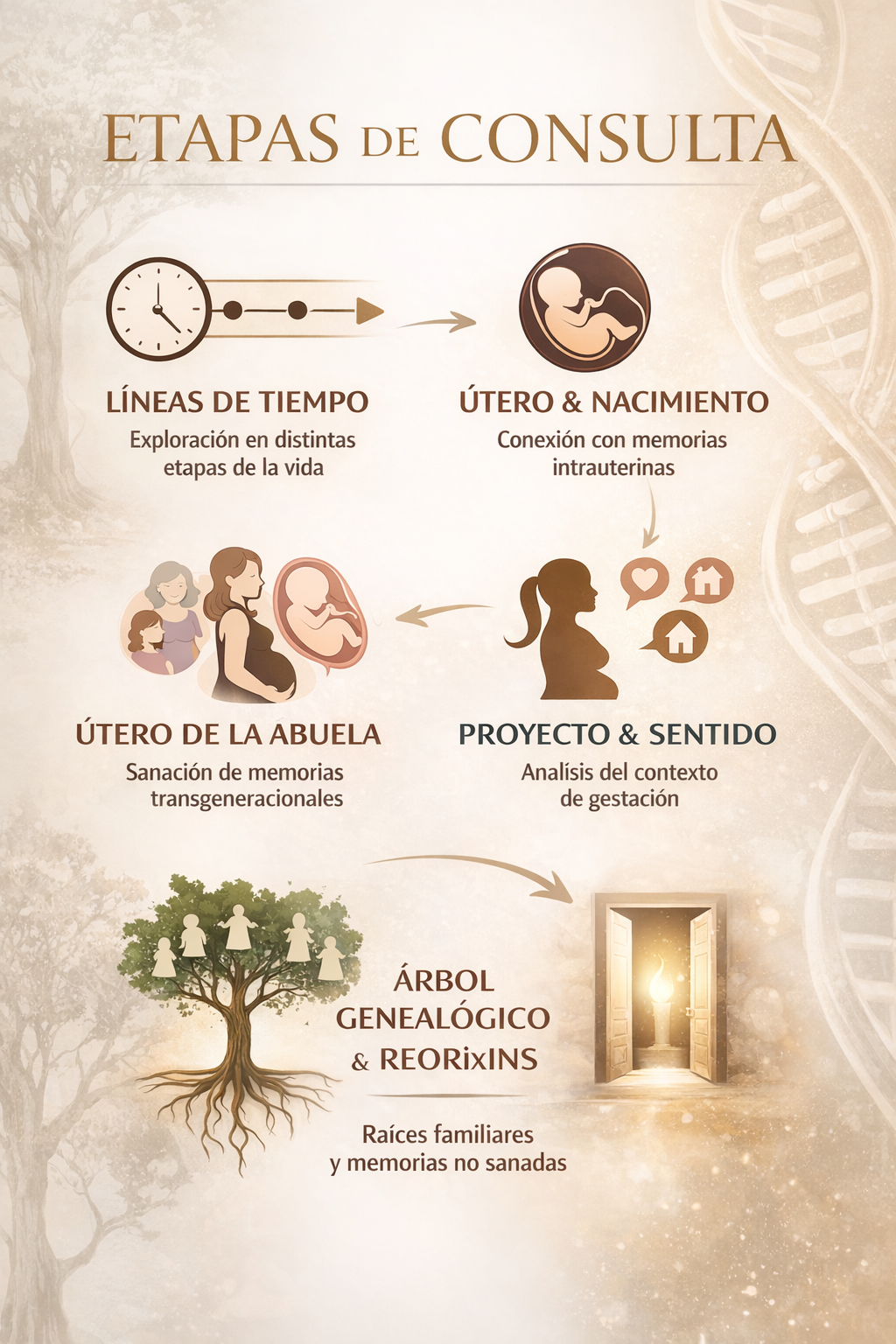 REORIxINS representa la etapa de cierre e integración del proceso. Aquí ampliamos la mirada hacia el inconsciente familiar, explorando memorias y acontecimientos que estan vinculados al origen del síntoma.